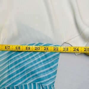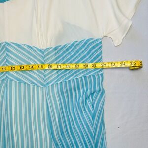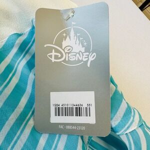 Disney Parks Dress Shop dress draws inspiration from the iconic Disneyland Hotel with its retro-inspired silhouette and color palette. This midi-length piece features a crisp white bodice with a Peter Pan collar, an embroidered blue 'D' logo. The pleated skirt showcases a vibrant blue and white vertical stripe pattern with a flattering chevron-style waistline. Designed with short flutter sleeves and a concealed back zipper, this dress offers a whimsical yet sophisticated look perfect for a day at the parks or a themed event.