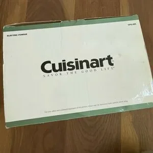New, open box, Cuisinart, electric fondue set. Includes the fondue pot, the cord and the plug, the fork ring and instruction manual - but it is missing the fondue forks. Still fully functioning using your own utensils. Cook broth or oil fondues with this stainless steel Cuisinart electric fondue pot. The nonstick interior surface ensures food does not stick, while dishwasher-safe parts make cleaning easy. This 1000W Cuisinart electric fondue pot has adjustable temperature probe settings for optimum cooking conditions and a recipe book to help you prepare a variety of meals. Cuisinart electric fondue set