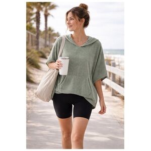 Crafted in a plush lightweight terry blend, it features a relaxed oversized silhouette with wide poncho sleeves, a soft V-neck hood, and a functional kangaroo pocket.