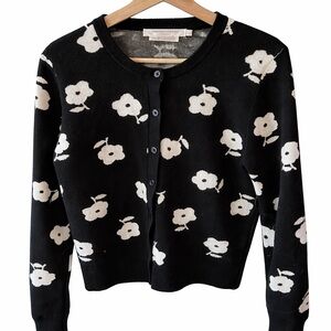 Chic black cardigan from Contemporaine (Simons) featuring an all-over white floral print.