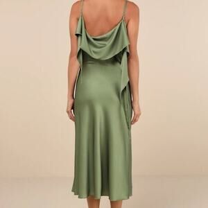The Tyler McGillivary Thistle Green Multi Satin Cowl Neck Midi Dress is ready to transport you and everyone you meet to a world of whimsy!