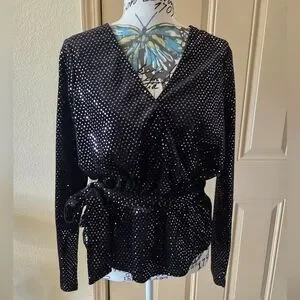 NWOT (never worn) elegant belted velvet black peplum top with silver shimmering polka dots. Perfect for a night out, holiday party, or special occasion.