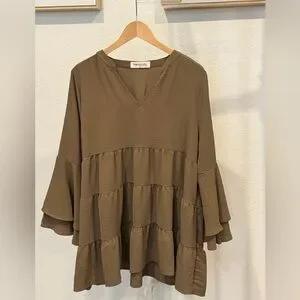 Brown tiered babydoll tunic dress from Impressions boutique. Features a flattering V-neckline and statement bell sleeves. Lightweight and flowy — perfect for fall layering with boots or leggings.