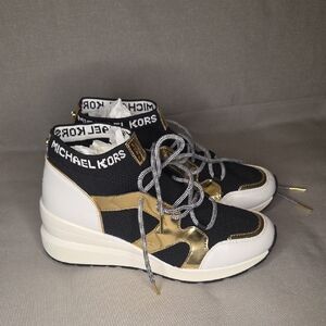 NWT Michael Kors Hilda Knit & Leather Sock Wedge Heel Lace Up Trainers Sneakers