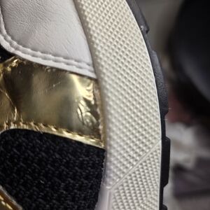 Color and Design: Black with gold metallic trim, featuring a high-top, lace-up style with a hidden wedge heel.