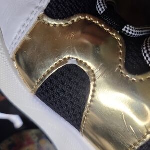 Worn once. Small scuff mark on back of right shoe and small indents on left shoe (see images). The gold accent has peeled a little from age on both shoes as shown in images.