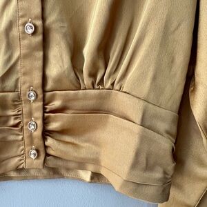Pretty like new crop style button down long sleeve blouse. Gold shiny finish, sparkle buttons (spare is there), cuffs, cropped silhouette. Unique shirred waist. 19” pit to pit flat and 19” long. Full sleeves. Like new.