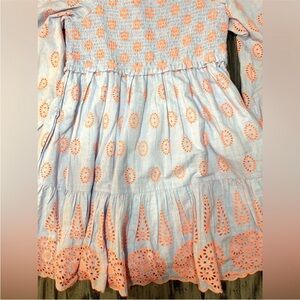 This fit-and-flare style features a smocked bodice and long puff sleeves with smocked cuffs. The dress is made from multi-colored eyelet fabric, specifically described as "Blue Peri Chambray Dobby Eyelet". It includes a square neckline and a tiered, ruffled skirt.