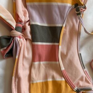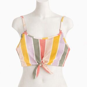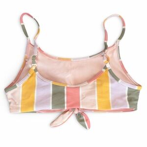 Cute Hollister striped bikini top featuring a fun multicolor design with soft pastel and warm tones. This flattering swim top has adjustable straps and a front tie detail that adds a stylish touch while allowing for a customizable fit.
