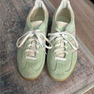 Women’s size 7 Adidas Gazelle in pastel green and off white. Overall in good condition, but please note there are imperfections such as slight dirt marks on the suede and leather. The most noticeable being on the toe (as pictured) and the back heels.