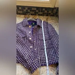Stylish purple tweed jacket featuring gold buttons. Perfect for a chic look.