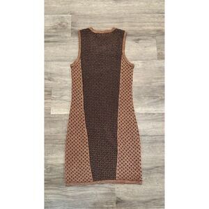Sleeveless knit sheath dress showcases a sophisticated color-blocked design in metallic copper and black. Crafted from a textured viscose blend with a subtle shimmer, it features a classic crew neckline and a flattering slim silhouette. The intricate pointelle-style knit patterns create a dynamic visual effect, while the full nylon lining ensures a smooth and comfortable fit. Perfect for transitioning from elevated daywear to evening events.