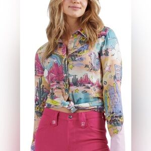 Wrangler x Barbie™ Illustrated Western Snap Shirt. This colorful, multicolor button-down is part of a special collaboration between Wrangler and Barbie.