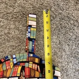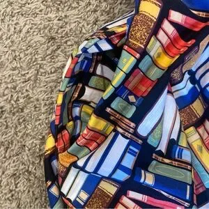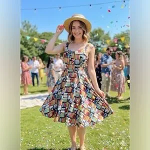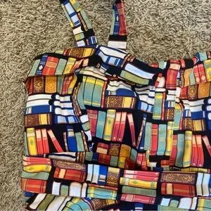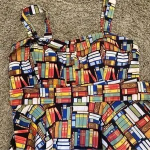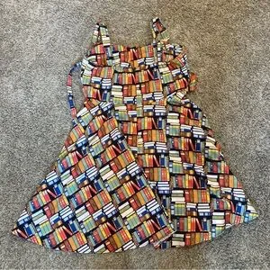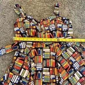 "Don't judge a book by it's cover" Dress by Eva Rose. Yes it has pockets so why wouldn't you buy it. Plus a padded chest area, cause why not!! And it is about the cutest book print you ever saw. Made in the USA. Retro Print. 40"s style silhouette. Measurements in photos. 97% Cotton. A vintage-style rockabilly dream sprinkled in a delightful books print. In a lovely size extra large, this literary-inspired beauty cinches at the waist with attached belt and flares with storybook swoosh, giving every twirl the energy of turning a freshly printed page. The playful pattern—tiny tomes stacked, scattered, and begging to be read—adds a whimsical wink to the classic silhouette, making it perfect for bookshop wanderings, library dates, or any day you want to feel like the heroine of your own tale. Smart, sweet, and wonderfully nostalgic, this dress is ready to write the next charming line in your wardrobe. No flaws.