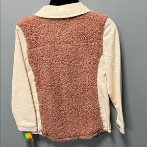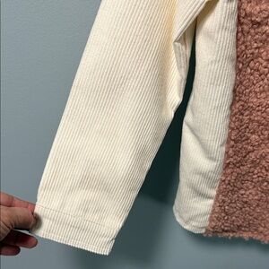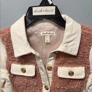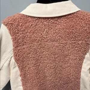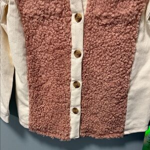 Charming button-up with pink sherpa front. Cream sleeves and collar add elegance. Ideal for warmth and style.
