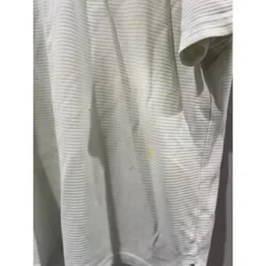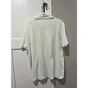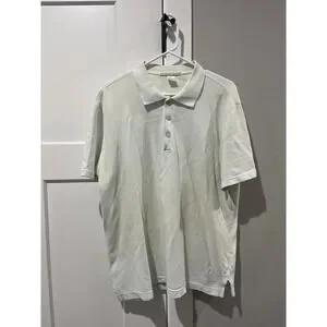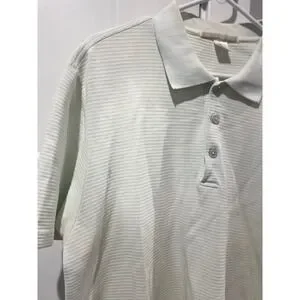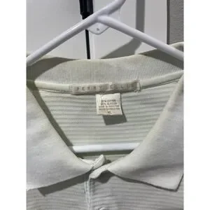 Perry Ellis short sleeve polo shirt crafted from 100% cotton with a subtle horizontal ribbed texture. This classic light green or mint colored top features a three-button placket and a traditional collar. Please note there are visible yellow stains on the front lower portion and some discoloration around the interior collar as shown in photos. Ideal for casual wear or as a project piece for stain removal.