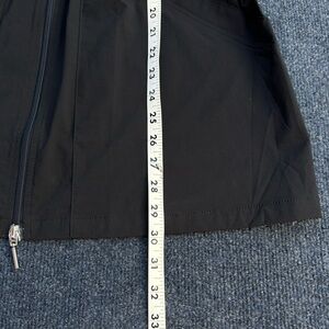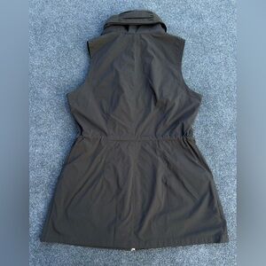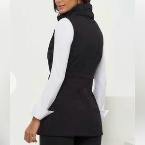Stylish black vest by Anatomie. Slim fitting silhouette, long length, two-way zipper, zip front pockets, adjustable drawstring waist inside coat, lightweight stretchy fabric perfect for travel and layering.