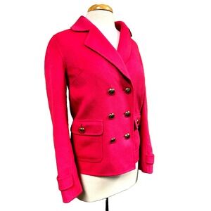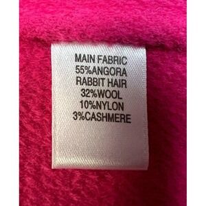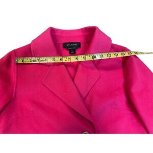 Color in person is a bright hot pink. This St. John Vintage Blazer is crafted from a luxurious Angora Rabbit Hair Wool Nylon Cashmere blend in bright hot pink. With a double-breasted cut, one-button sleeve tabs, and shining gold buttons, this mid-length blazer features a notch lapel and flap pockets. The upscale vintage design includes pick stitching and is perfect for travel, parties, or business occasions. This size 2 blazer is a classic addition to any wardrobe.