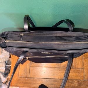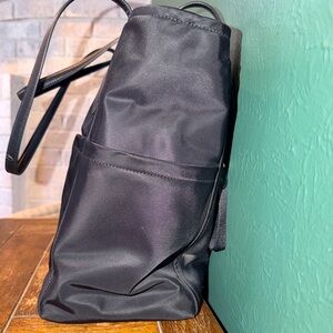 This bag was deigned to function as both a stylish tote and diaper bag for everyday use. Sleek black tote with durable recycled nylon and gold tone hardware. Features a top zip closure, front zip pocket, interior pockets, changing pad pocket.