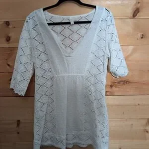 This elegant white eyelete top is perfect for any occasion. Its intricate design adds a touch of sophistication to your wardrobe. Pair it with your favorite jeans or skirt for a chic look.