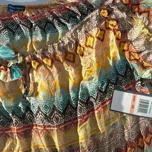 Pretty boho design with vibrant pattern. Elastic neckline can be worn on or off shoulder. Tie tassle drawstring at neckline. Side vents. New from Democracy brand. Plus size 2X