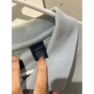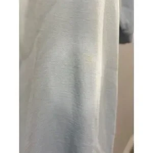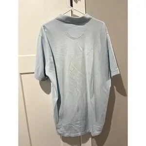 IZOD Silkwash polo shirt in a light blue hue features a classic two-button placket and short sleeves. Crafted with a soft piqué knit texture, it includes an embroidered crest logo on the chest for a refined touch. The design is finished with a ribbed collar and cuffs, along with a subtle drop-tail hem. Note that there is some light yellowing around the interior collar and a small faint spot on the lower front as shown in photos.