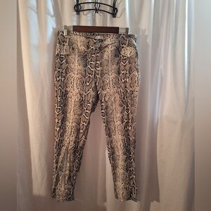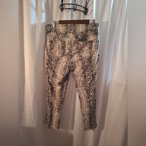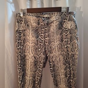 Chic snake print pants by Van Heusen. Features a striking black and cream pattern. Ideal for a fashionable statement. side to side measurements is 16.5"with stretch rise is 10" inseam is 25" top of waist to bottom hem is 34" have back pockets bundle more items for bigger deals Bin-136