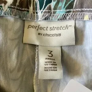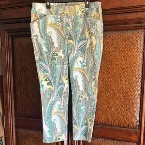 Colorful paisley design with a chic ankle cut. Features blue, yellow, and brown tones. Perfect for stylish outings.