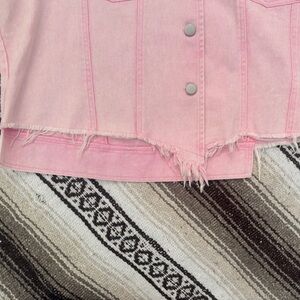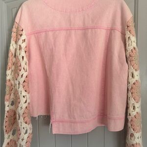 BIBI Pink Washed Denim Jacket Crochet Granny Square Sleeves Boho Cowgirl SZ SM
