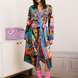 Elevate your loungewear with this stunning multicolor silk robe, adorned with vibrant floral and botanical patterns. Perfect for casual wear, its loose fit and midi length ensure comfort and style. Ideal for vacation or everyday use, this beautiful robe features a classic lapel neckline and regular sleeves, making it a versatile addition to your wardrobe.