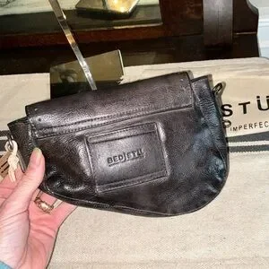 Chic Bed Stu crossbody with distressed black leather. Features a rugged design and adjustable strap. Ideal for versatile styling.
