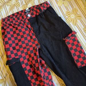 grunge black and red checkered cargo pants with stretch waist and tapered legs by Hot Topic. great for many types of alternative styles or casual wear. waist stretchs a good amount.