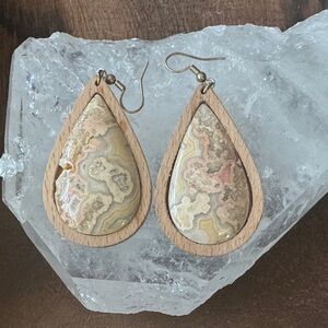Elegant teardrop earrings with pink lace agate stone and wood design. Features earthy tones. Pink lace is a calming and nurturing stone that promotes self-love and fosters joy and optimism.