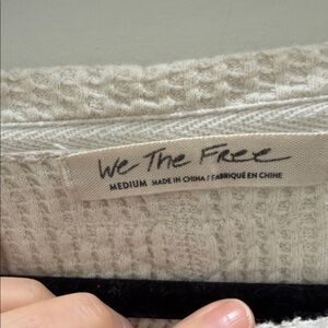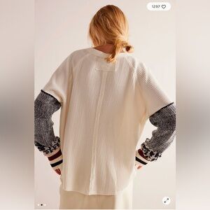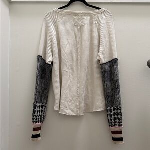 Features: Scoop neckline, waffle knit fabrication, exposed seaming, contrast sleeves, side slits at bottom, rounded bottom hem