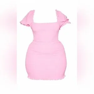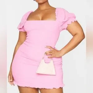 16 • PrettyLittleThing • Pink Square Neck Puff Sleeve Shirred BodyCon Mini Dress