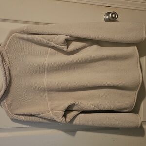 Soft beige fleece pullover by Patagonia. Features a quarter snap and front pocket.