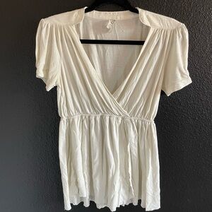 Chic wrap blouse with short sleeves. Soft fabric and elegant drape. Ideal for versatile styling.