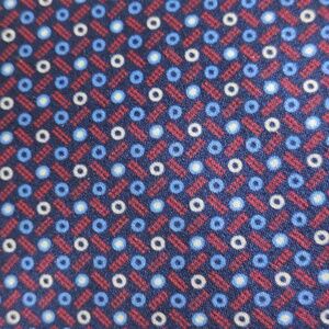 This blue silk necktie featuring a repeating geometric pattern of red and white circles.