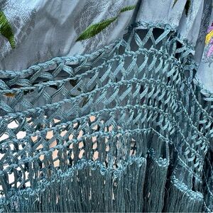 Flowy blue maxi dress with vibrant floral embroidery. Features fringe hem and spaghetti straps. Perfect for a bohemian look.