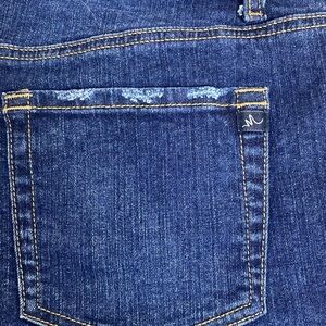 M Jeans by Maurices Dark Denim Mid Rise Jean Shorts. Button fly. Distressed pockets. Sz 12. 5” inseam. NWOT
