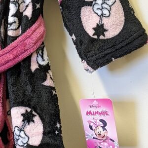 Cozy Disney Minnie Mouse robe in pink and black. Features a playful Minnie Mouse pattern.