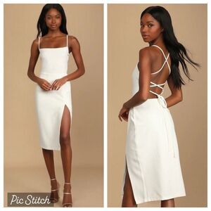 Gorgeous dress! Selling for $60 at Lulus. Make the night extra flirty when you show up in the 4TH & RECKLESS Maple White Lace-Up Column Midi Dress! Medium-weight woven fabric shapes this dress that has a straight neckline and fitted bodice that's supported by slender straps that lace down and tie at the back. The column skirt ends at a midi hem with a thigh-high front slit. Hidden back zipper/clasp. Color is ivory not pure white.