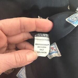 This RIKI sleeveless vest, made in the USA, features a charming novelty tea pot pattern on a black background. With its lightweight rayon fabric and button-front detail, this size medium vest is perfect for layering. Add a touch of vintage-inspired fun to your outfits!