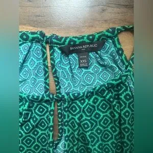 Chic, flattering, and easy to style — this Banana Republic geometric print dress features a modern emerald green and navy diamond pattern with a soft stretch jersey fabric that drapes beautifully. Designed with a keyhole neckline, self-tie waist, and a comfortable pullover fit, it’s perfect for layering through the cooler months.