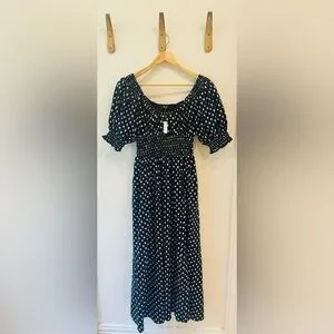 NWT Madewell Smocked-Waist Midi Dress in Black/White Shibori Dot Print Size 00