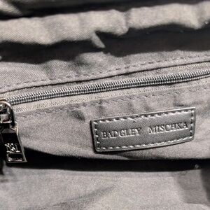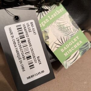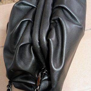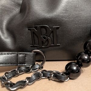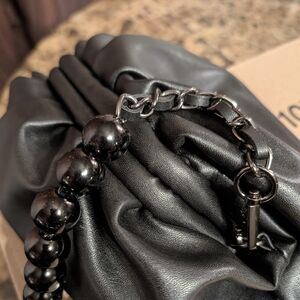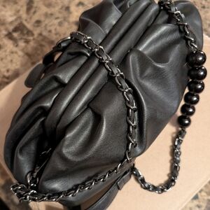 Chic black crossbody with glossy bead and chain strap. Features iconic logo accent.
