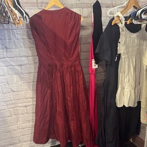 Elegant burgundy dress with a sleeveless design. Features a fitted bodice and flared skirt. Perfect for any occasion.
