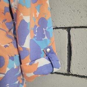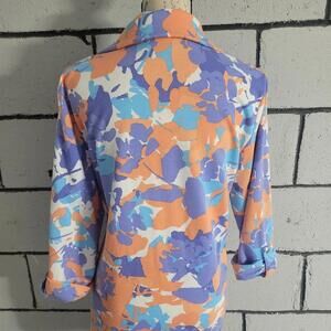 Women's pullover top features a blend of purple, orange, and blue hues with a quarter zip in front, & bands to roll up the sleeves to 3/4.