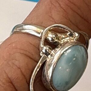 This sterling silver ring features a stunning blue genuine,larimar stone set in a contemporary artisan, made silver band. The tag says 7 1/2. I believe it’s more like a 7 1/4. It is sterling silver so it can be sized this is 100% pristine and authentic.