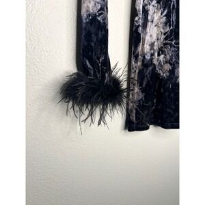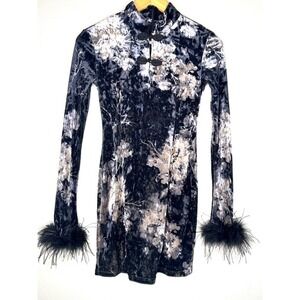 Embrace captivating elegance in this striking black velvet dress. The opulent floral print dances across the luxurious fabric, while the traditional mandarin collar and intricate frog button closures evoke timeless sophistication. Each sleeve is adorned with a playful cascade of black feathers, adding a touch of glamorous movement and refined drama. This dress is perfect for a romantic evening out, a chic cocktail party, or a special holiday gathering.